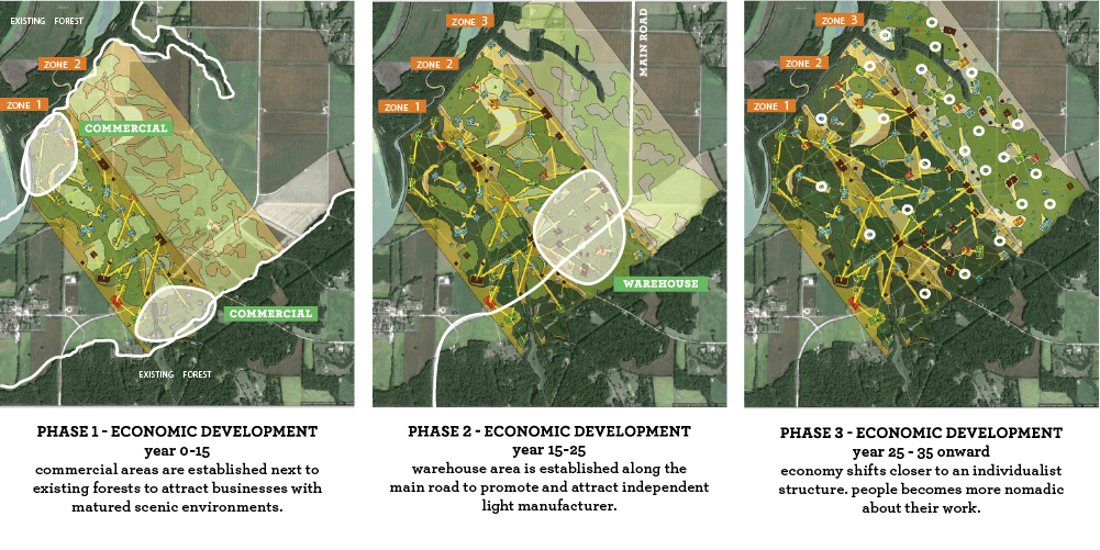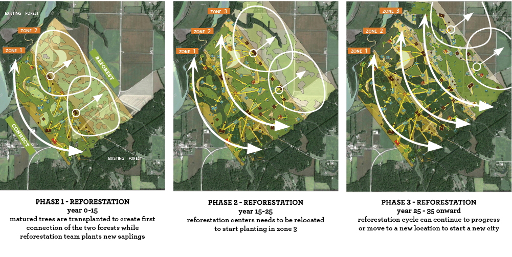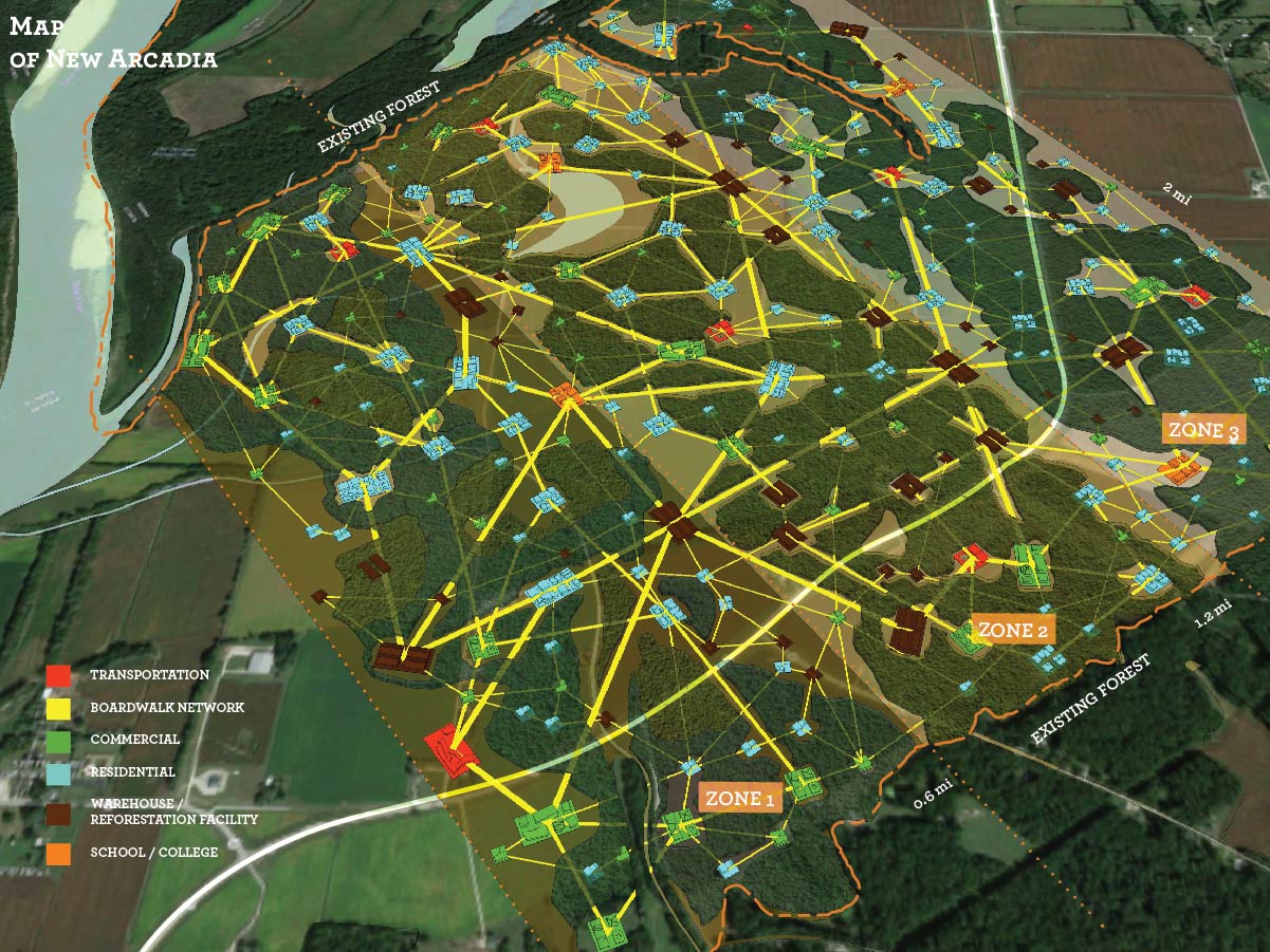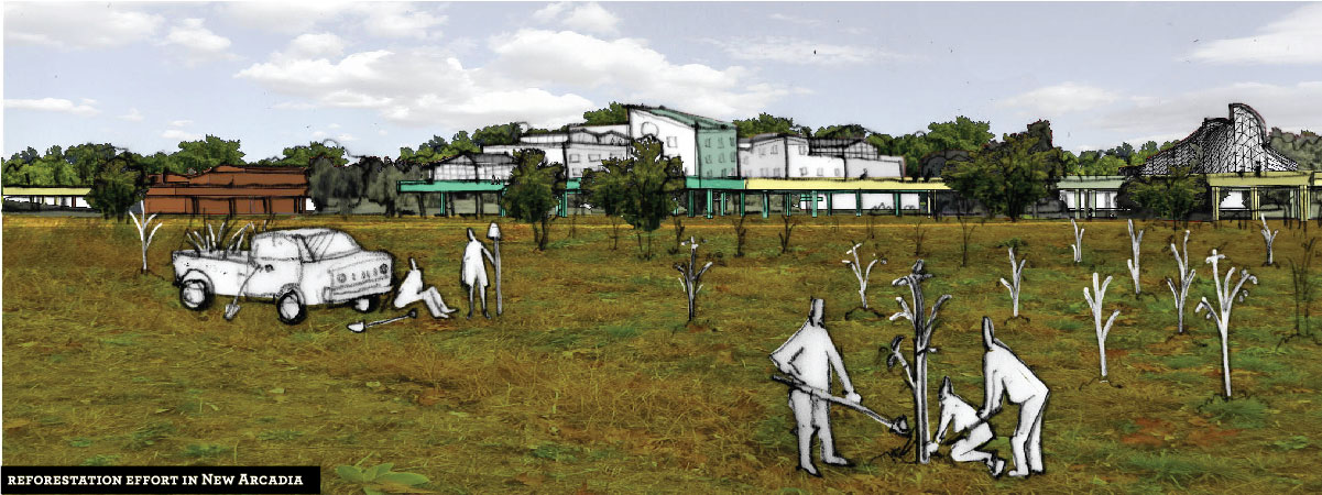 New Arcadia is an ecological and economic urban design approach that imagines a new urban typology where urban dwellers can live in harmony with nature through strategic reforestation.