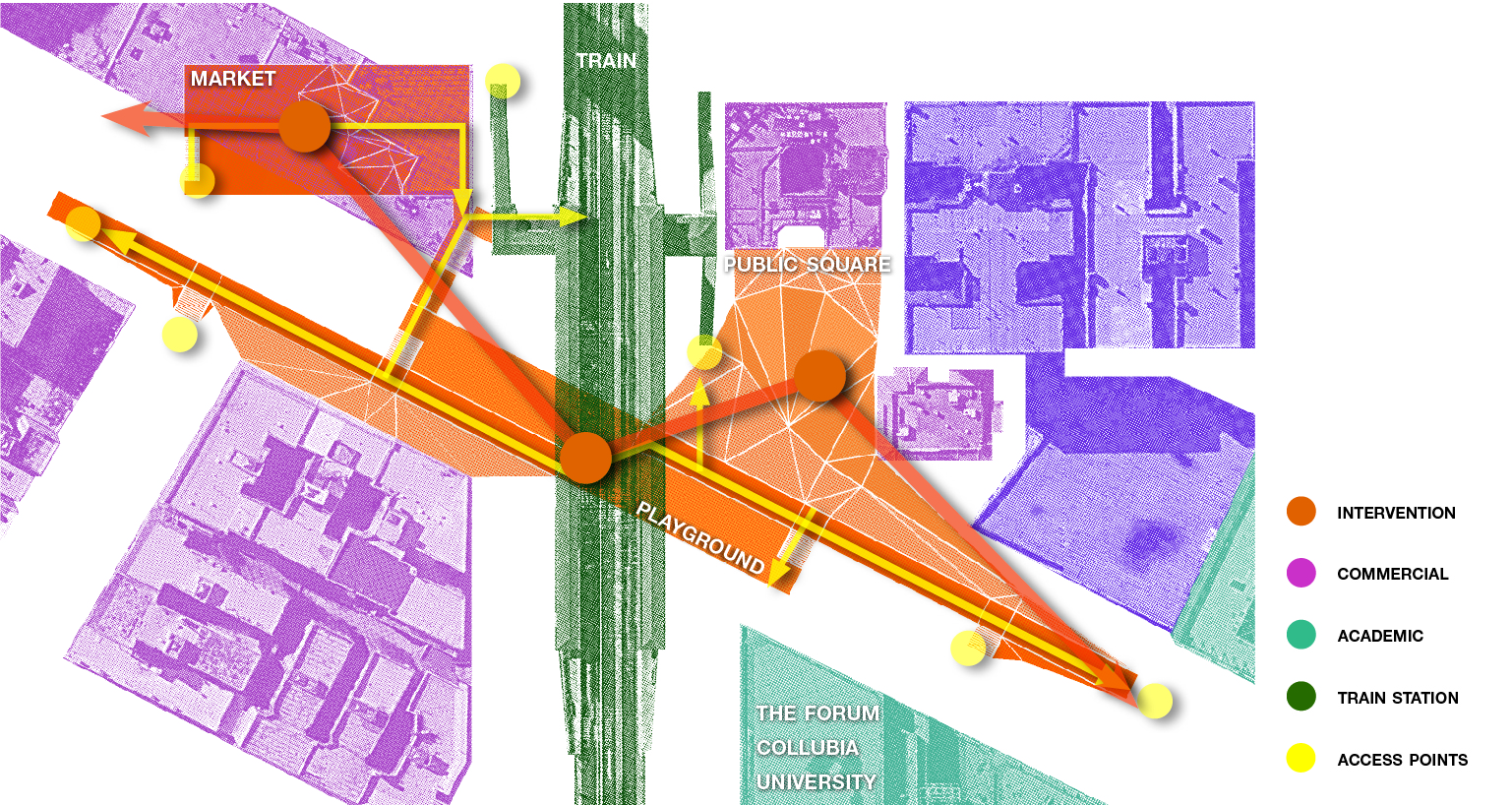 This project uses urban architectural intervention to challenge the urban convention and attempt to break the barriers with the reprogramming of urban public space.