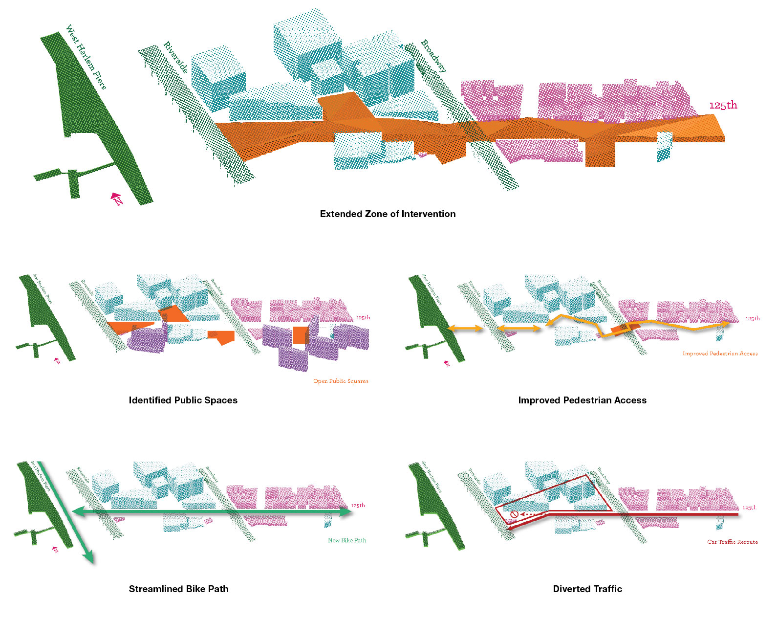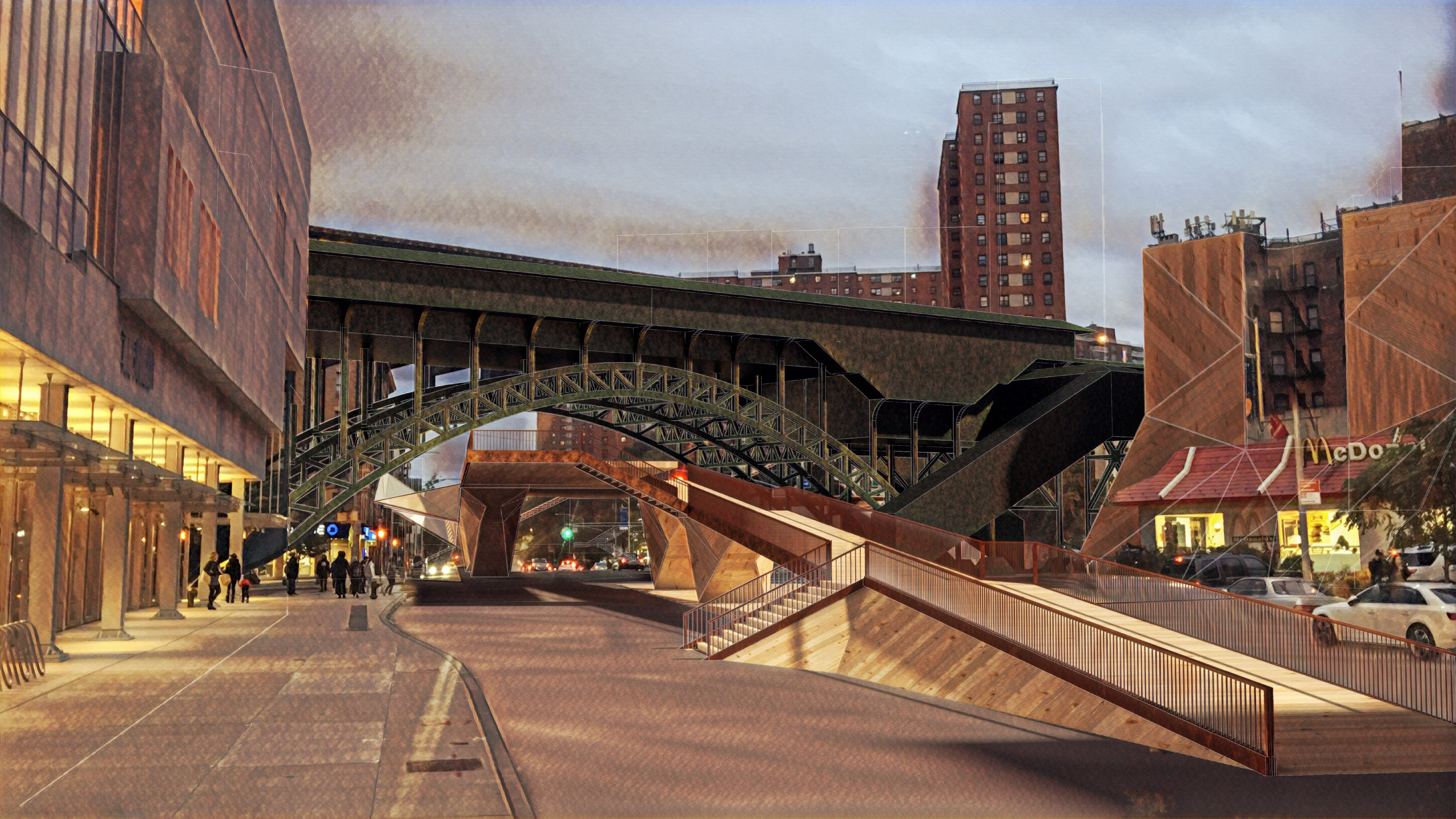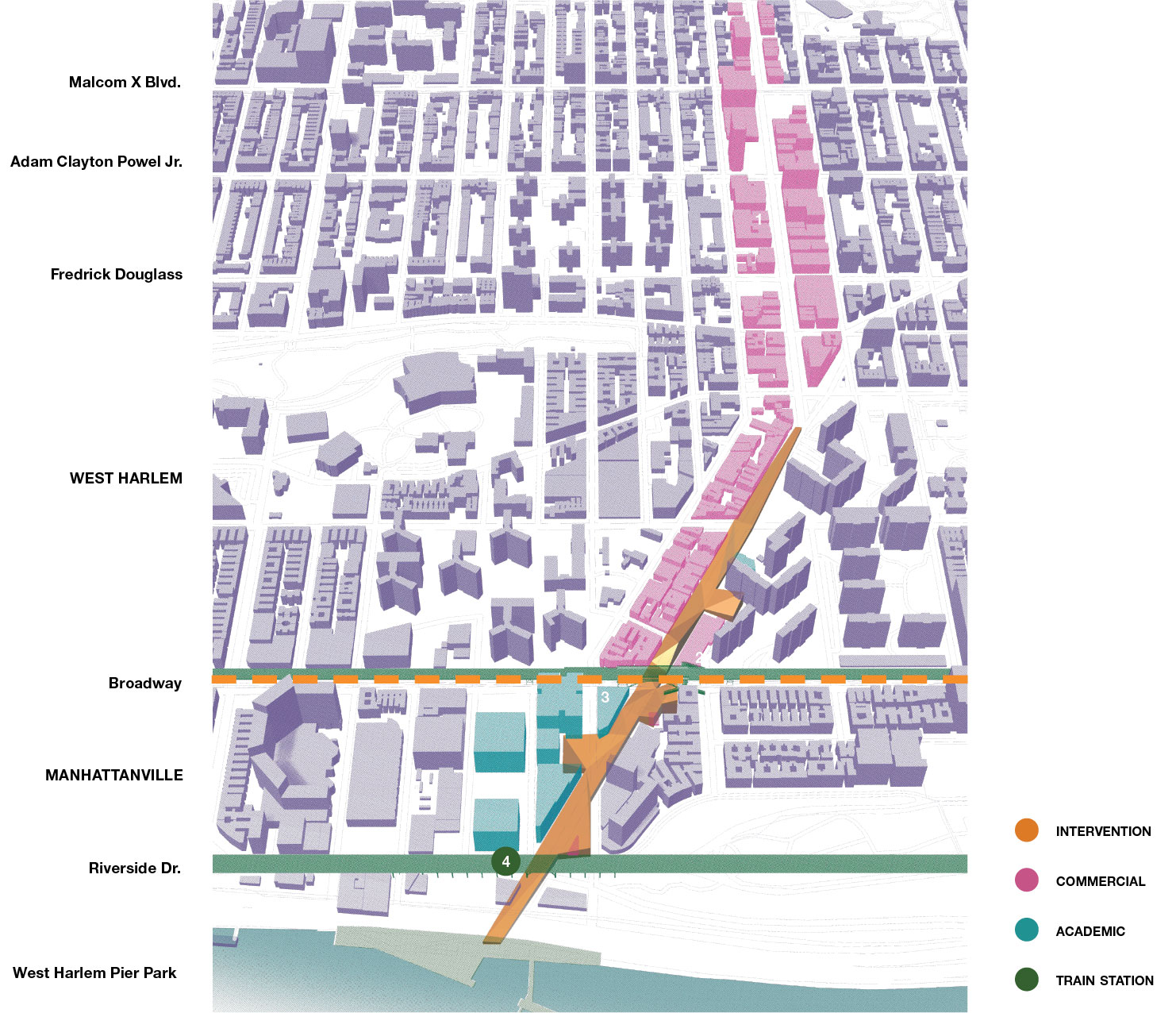 Out of a variety of sections that the broadway cuts through, the 125th st intersection represents one of the more politically loaded cross-section that the broadway ave encounters. With the expansion of Columbia University in Manhattanville colliding with the most prosperous axis of Harlem, The urban condition of this intersection reflects the division between the two demographics thorough the materiality