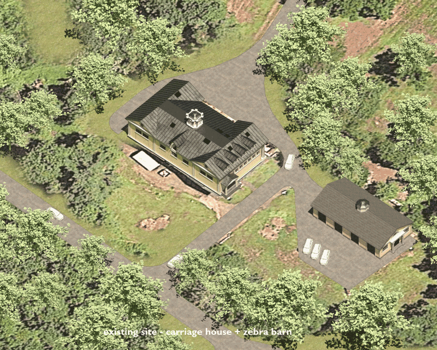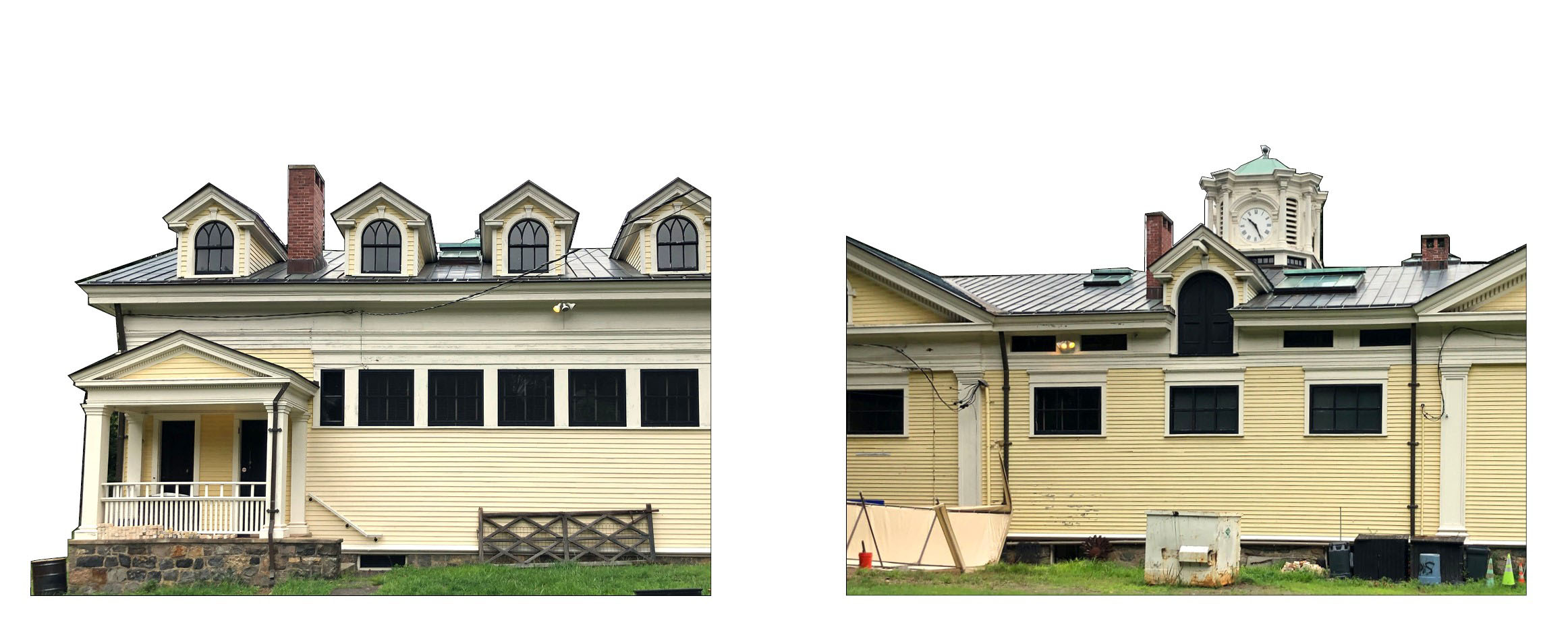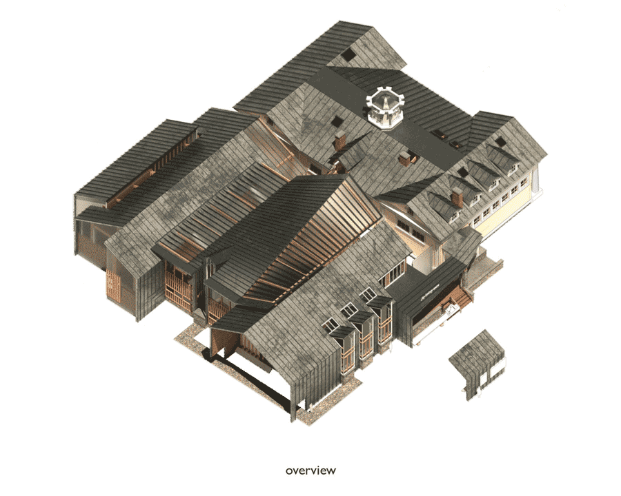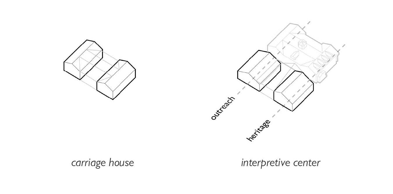 Following cues from the Carriage House, the building’s massing began with projections of the pitched roof joint by an envelope. The site and features of the Carriage House (i.e., clock tower, dormer, low sill windows) show traces of the labor and social hierarchy involved in maintaining the estate.