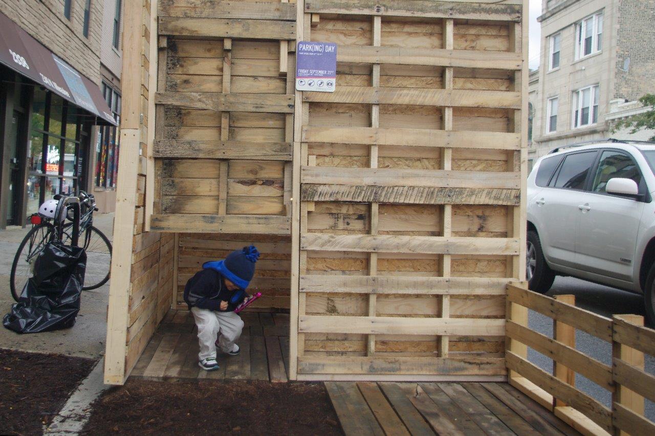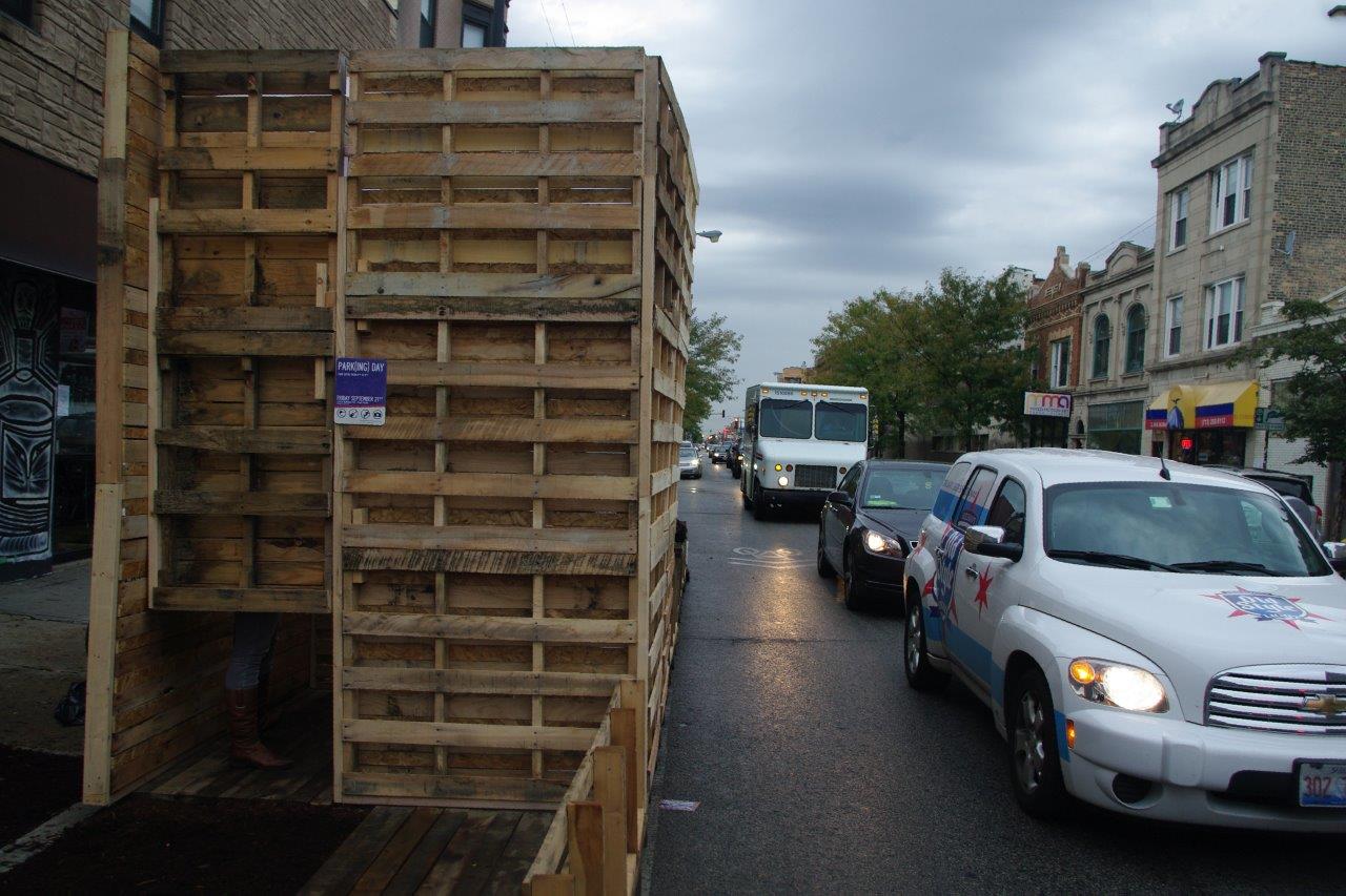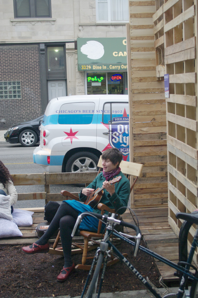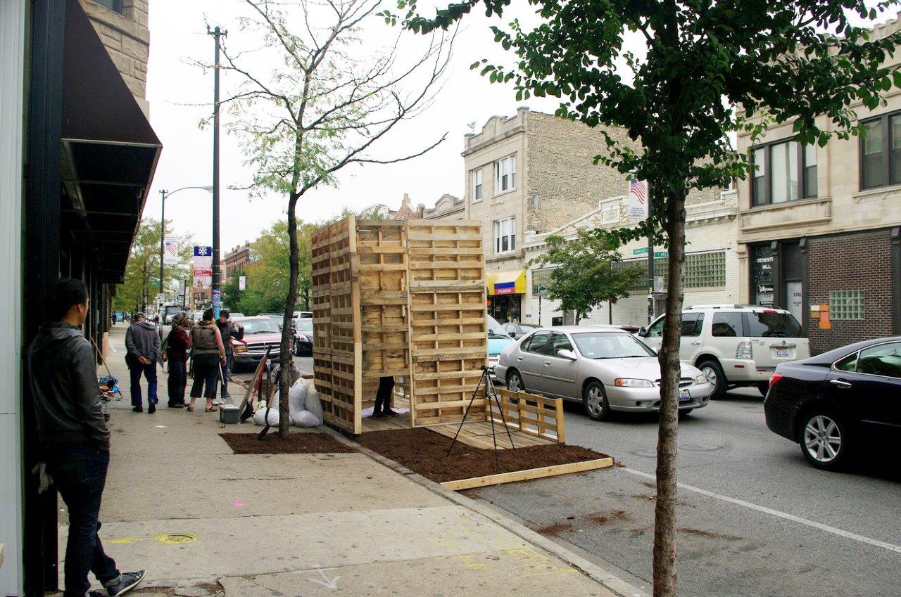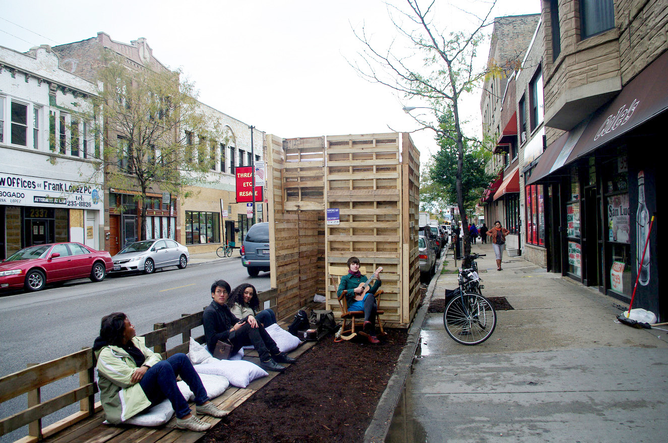 architecture for Humanity Chicago transformed multiple parking spaces in Logan Square into a venue for public activity. The installation morphs asphalt into open space that invites visitors to relax and engage with other members of the community.
