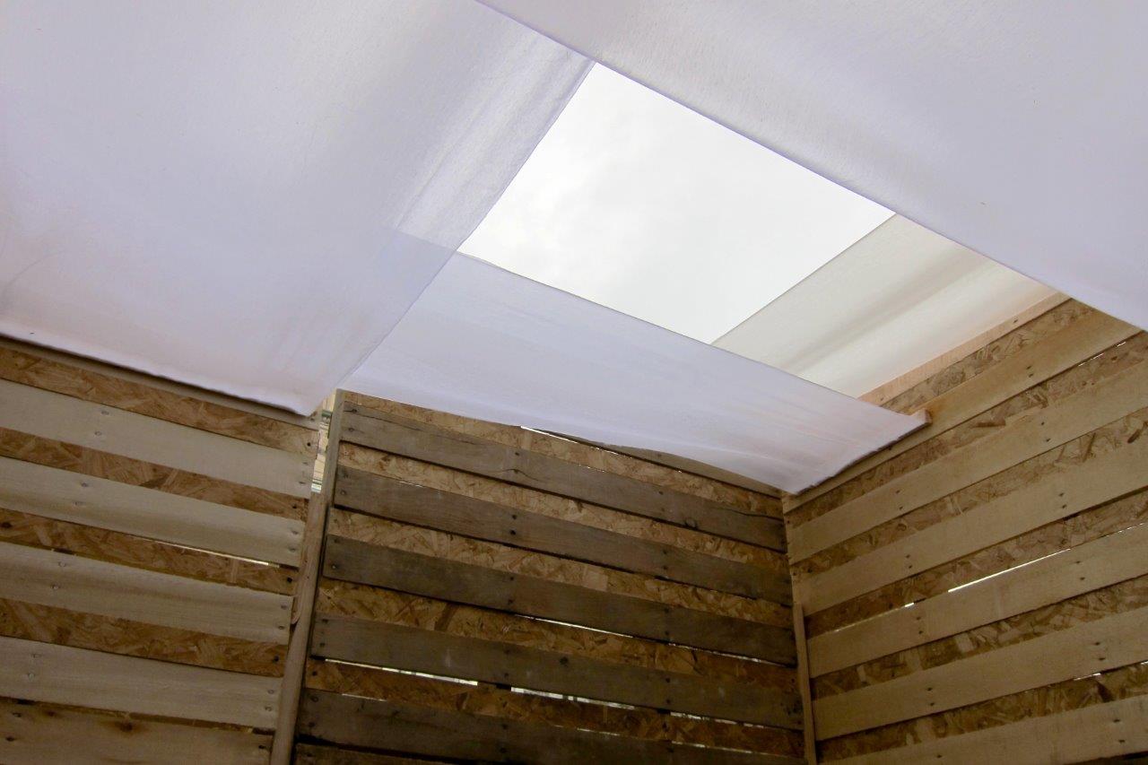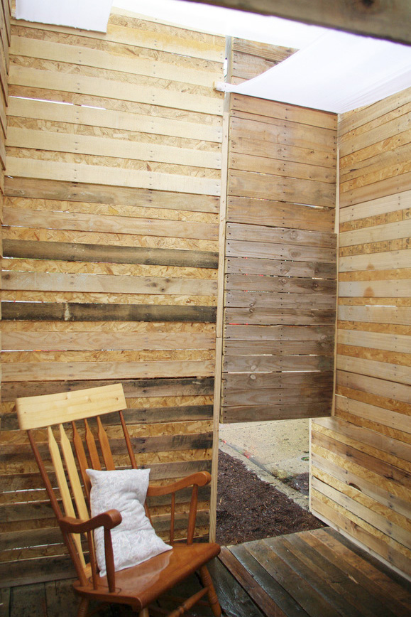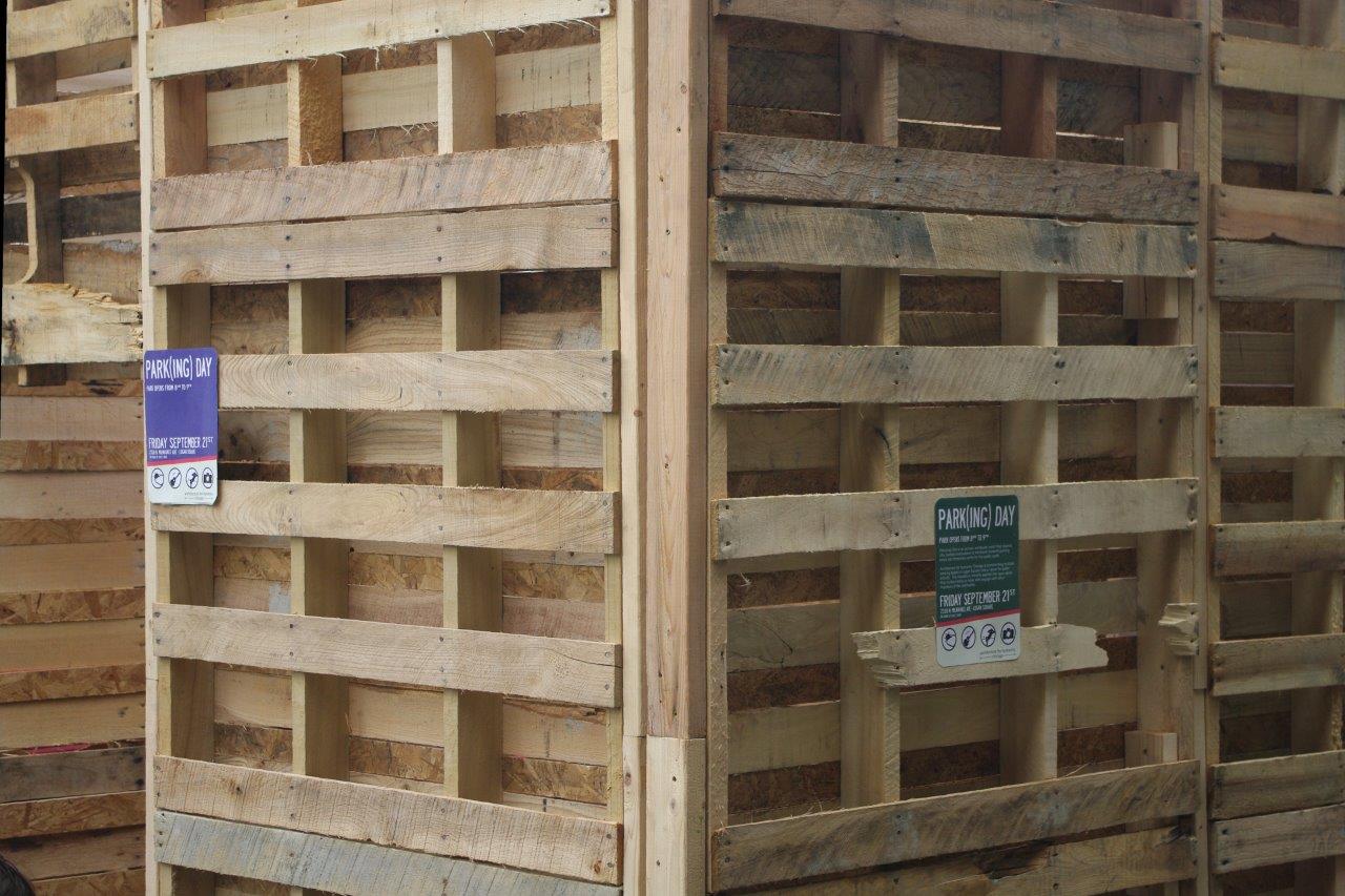 Materials used in this project are all recycled or donated. Approx. 40 pallets were used for construction. The entire structure is partially assembled and transported to site.