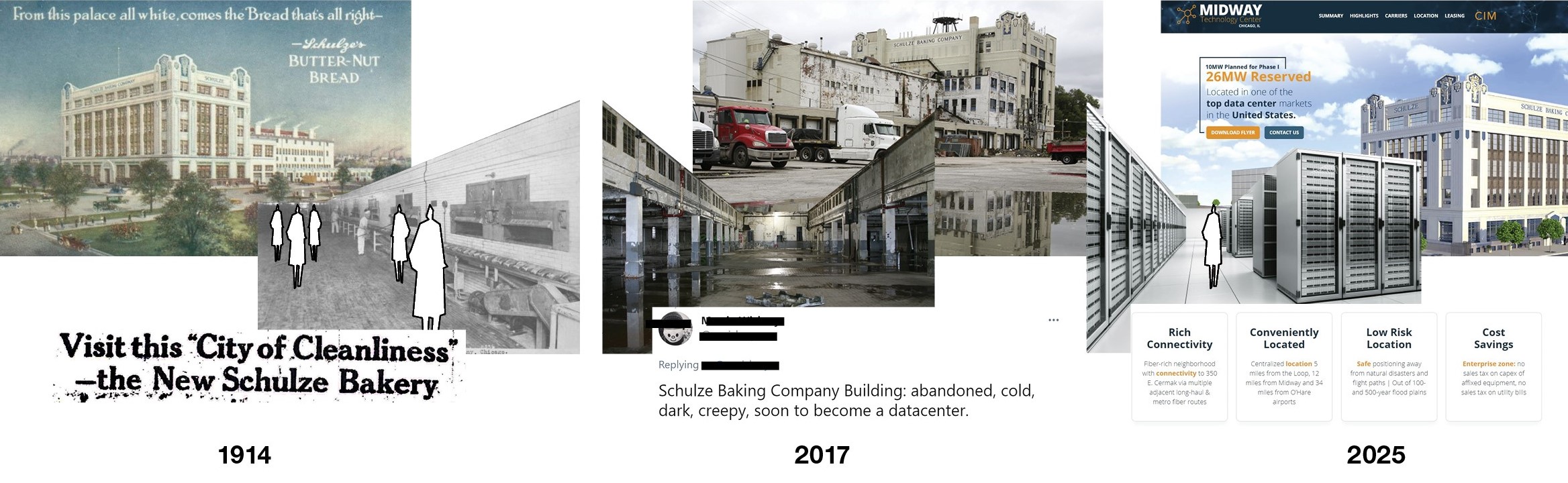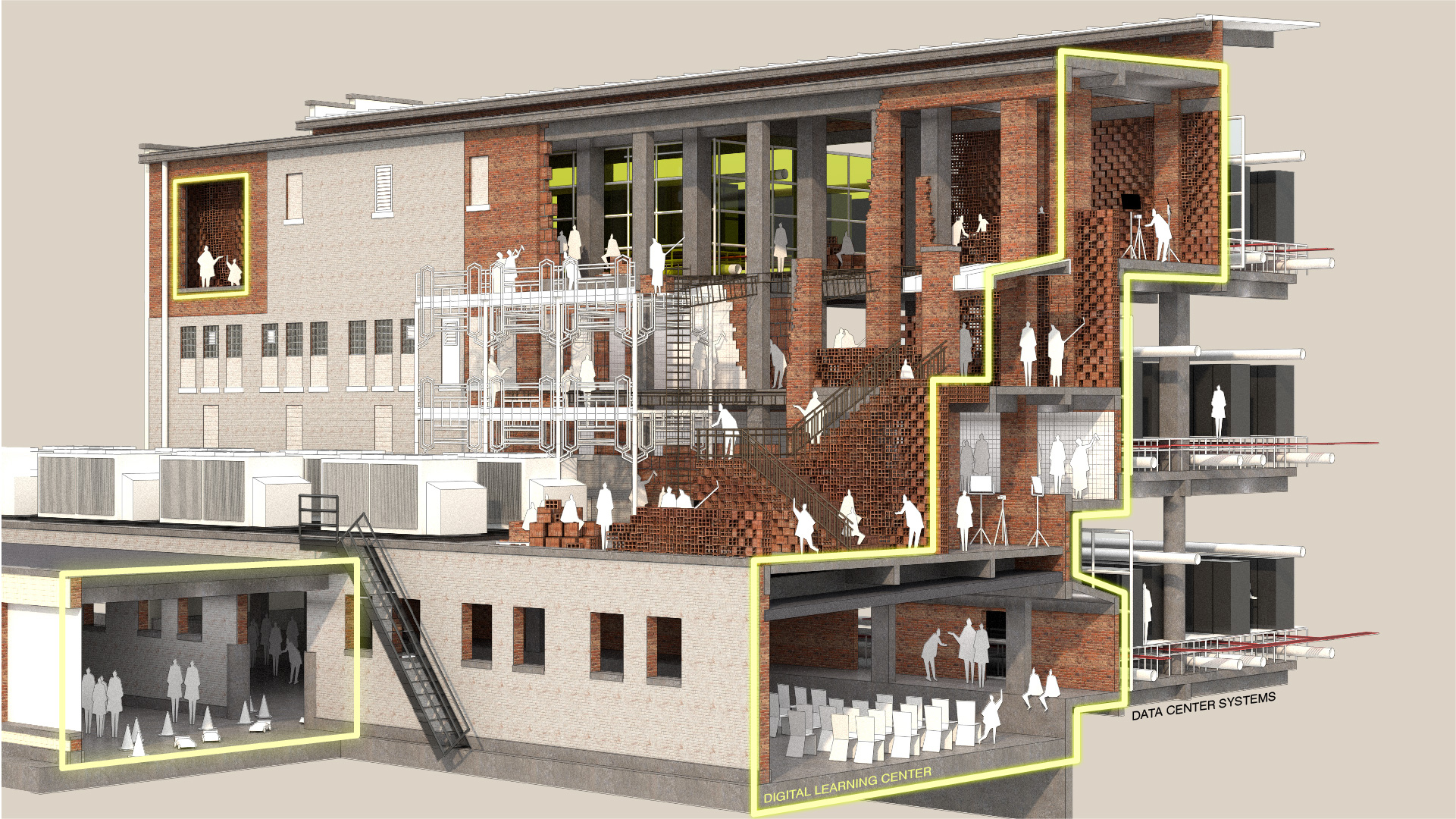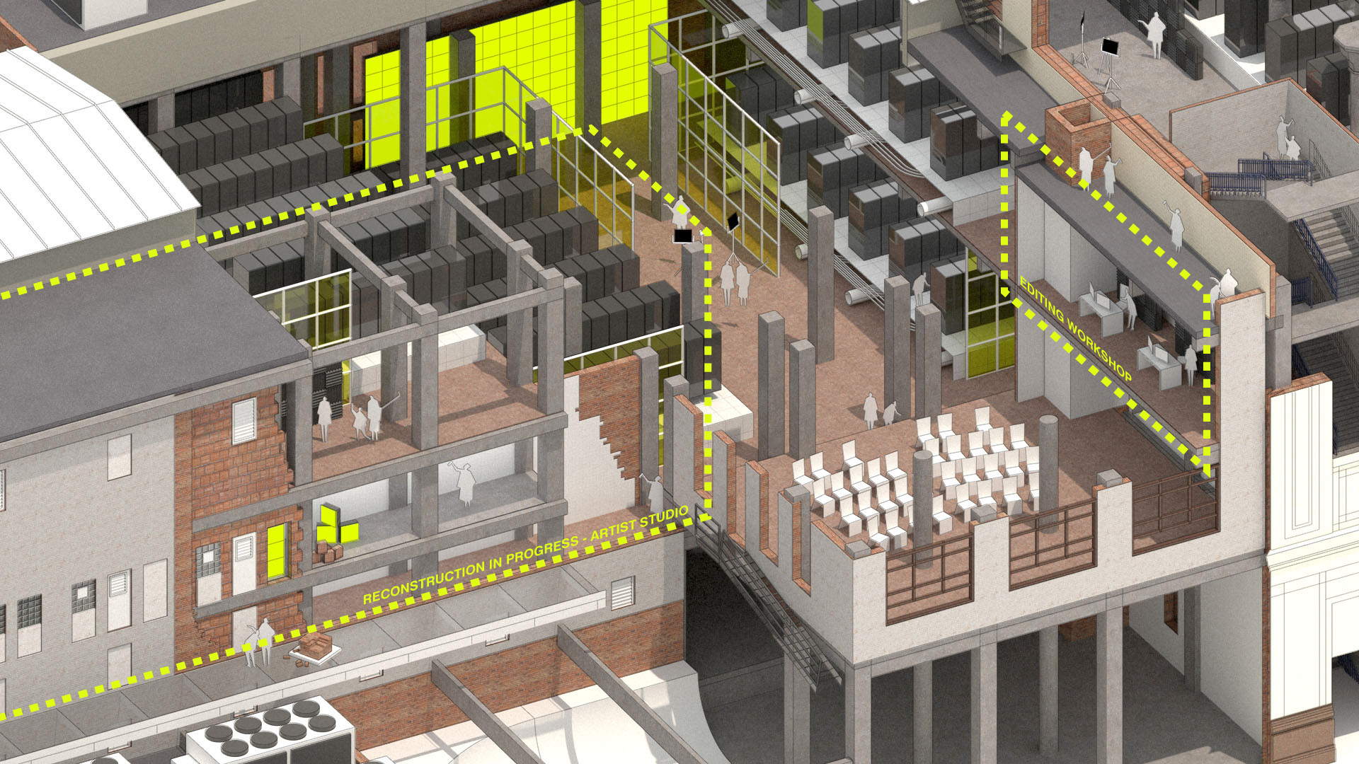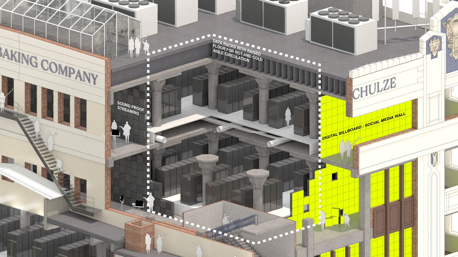 A historic bread factory built in 1914 Southside of Chicago, The Schulze Baking Company Factory is currently destined to be renovated and retrofitted with a data center that houses countless server racks which serves a commercial tenant. As a response to this condition, the project is an architectural negotiation of ownership and access to the building, which confronts the exploitative nature of the development. With a counter-exploitative approach to capital development, the project’s goal is to trouble and disassemble the established condition and restore the community rather than the objective architecture.