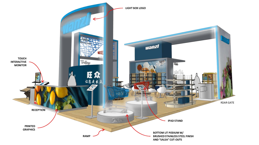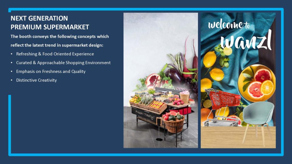 In this years ChinaShop (China Retail Industry Expo), we turn our focus to the increasing trend of fresh food-centric grocery stores. Appetizing fresh food imagery are juxtaposed with Wanzl’s products to draw a direct connection between the two. Bright colors are also boldly used on top of the corporate blue color to bring a new image to our potential customers.